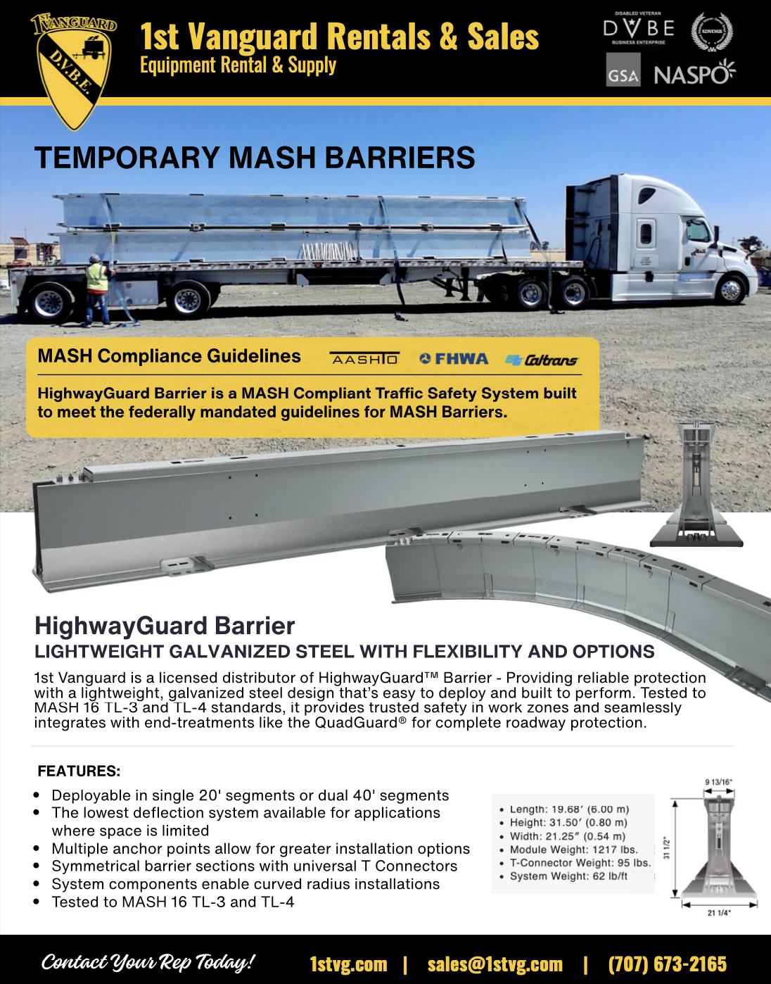 If you have questions about MASH-Compliant Temporary Barrier Systems, First Vanguard can help! CalTrans requirements for temporary barrier systems have begun to take effect. Contractors are being required to use MASH compliant barriers on targeted projects over the next year and a half, and ALL projects after December 31, 2026!
