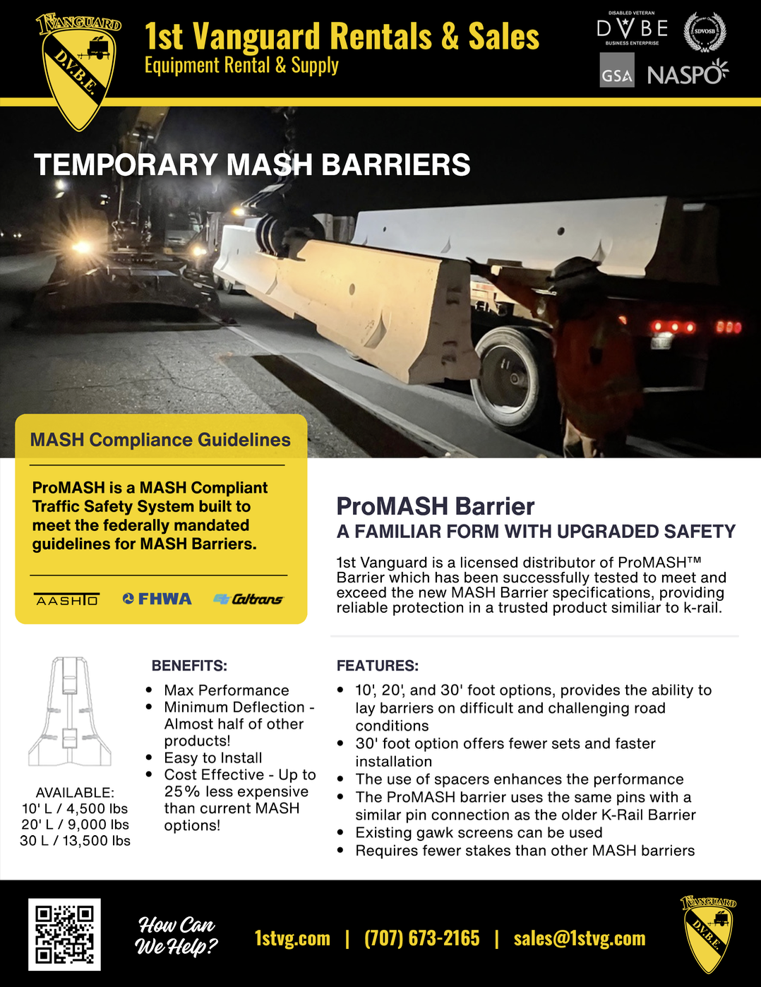 1st Vanguard is a licensed distributor of ProMASH™ Barrier which has been successfully tested to meet and exceed the new MASH Barrier specifications, providing reliable protection in a trusted product similiar to k-rail.