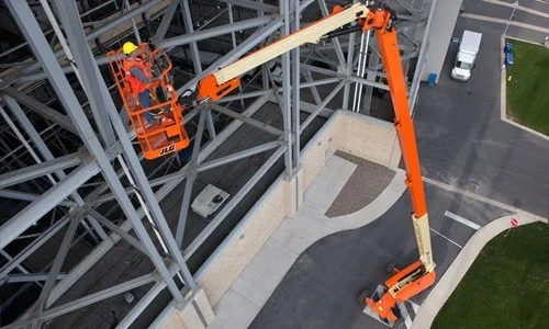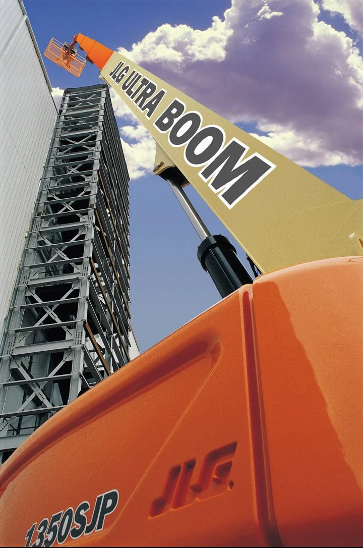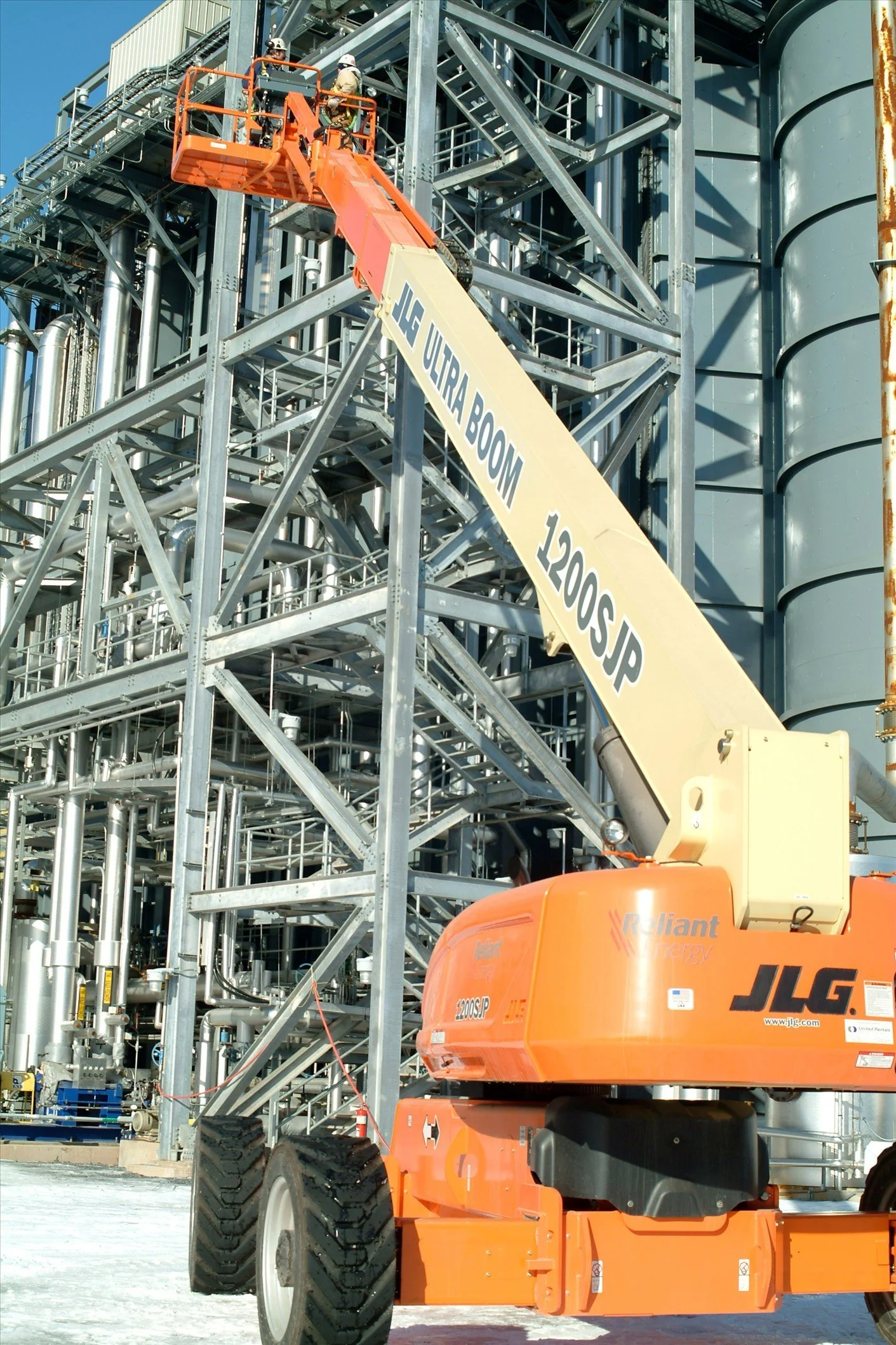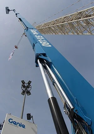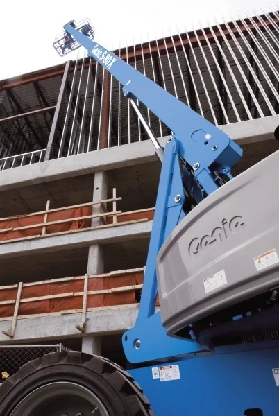 /This four wheel drive, 66-foot telescoping boom lift rental is geared for outdoor construction and for industrial work. It can be steered through compact spaces and with good operating speed and wheel traction, this boom lift makes navigating a job site easy.