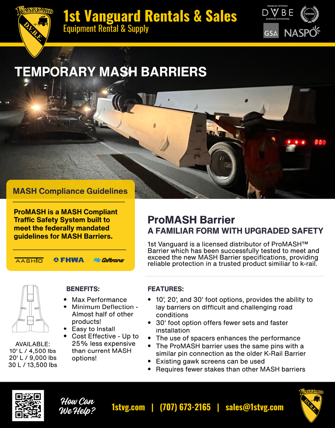1st Vanguard is a licensed distributor MASH compliant temporary barrier systems. Our experts are here to help you meet the federally mandated guidelines for MASH Barriers. Call us to learn more about the traffic safety systems that exceed the new MASH Barrier specifications.